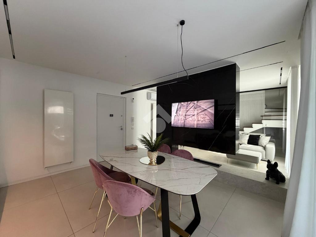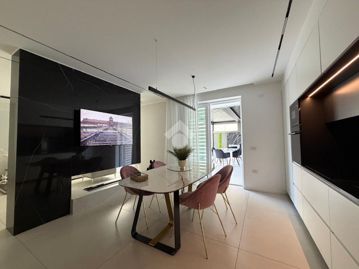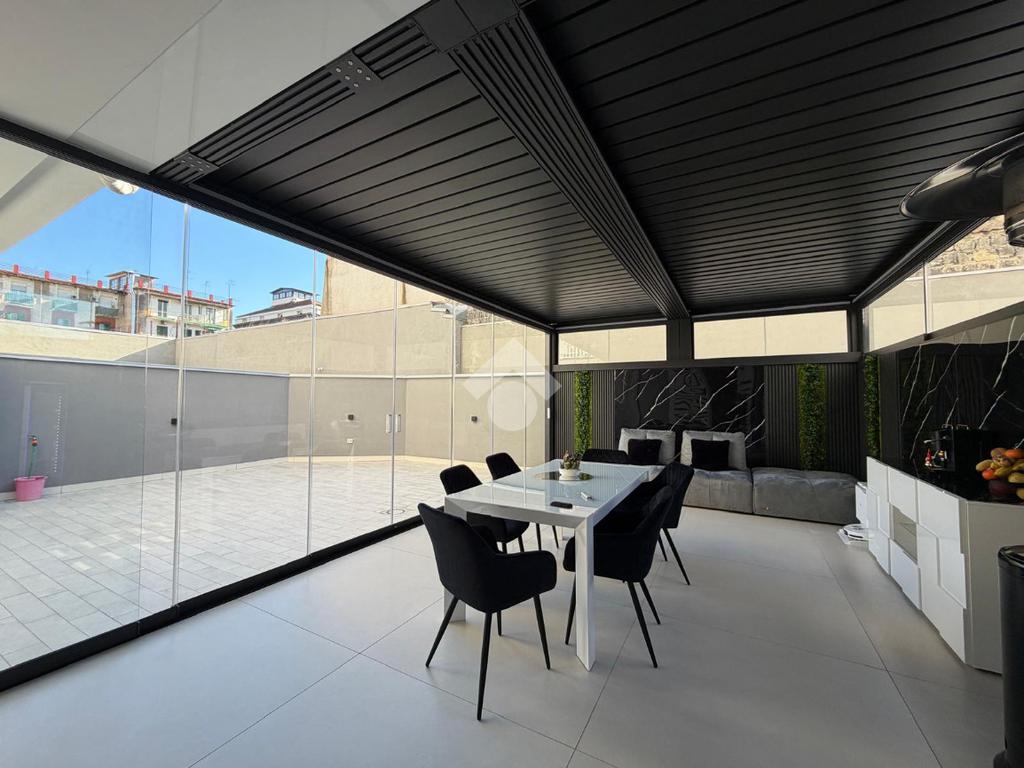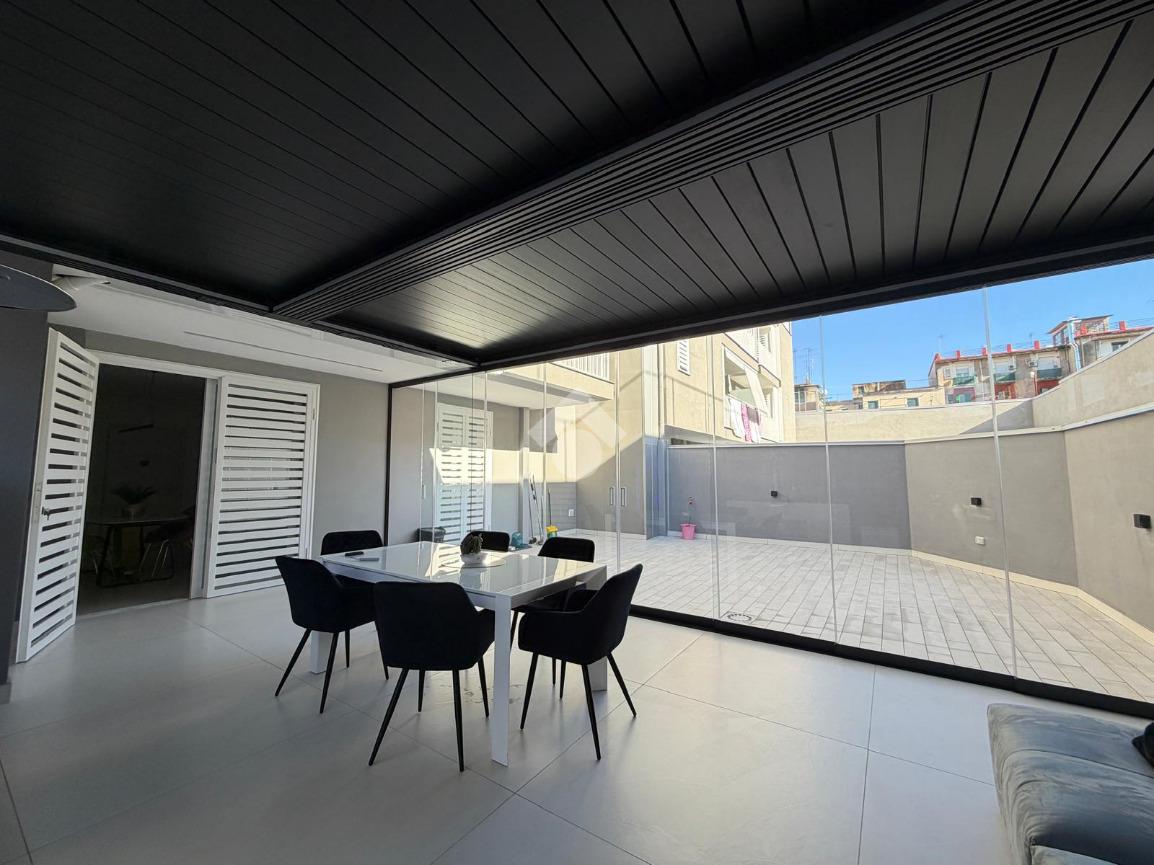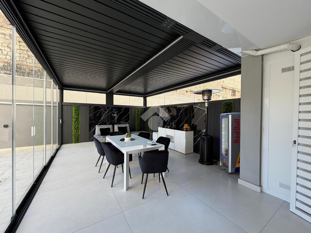 L’ingresso si apre su una ampia zona giorno open space, ben organizzata tra area living e zona pranzo, con accesso diretto al terrazzo a livello, vero punto di forza dell’abitazione. Il terrazzo è dotato di copertura scorrevole, che consente di vivere lo spazio esterno in ogni stagione.