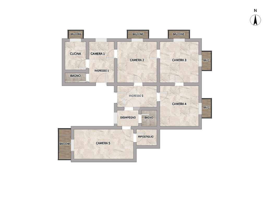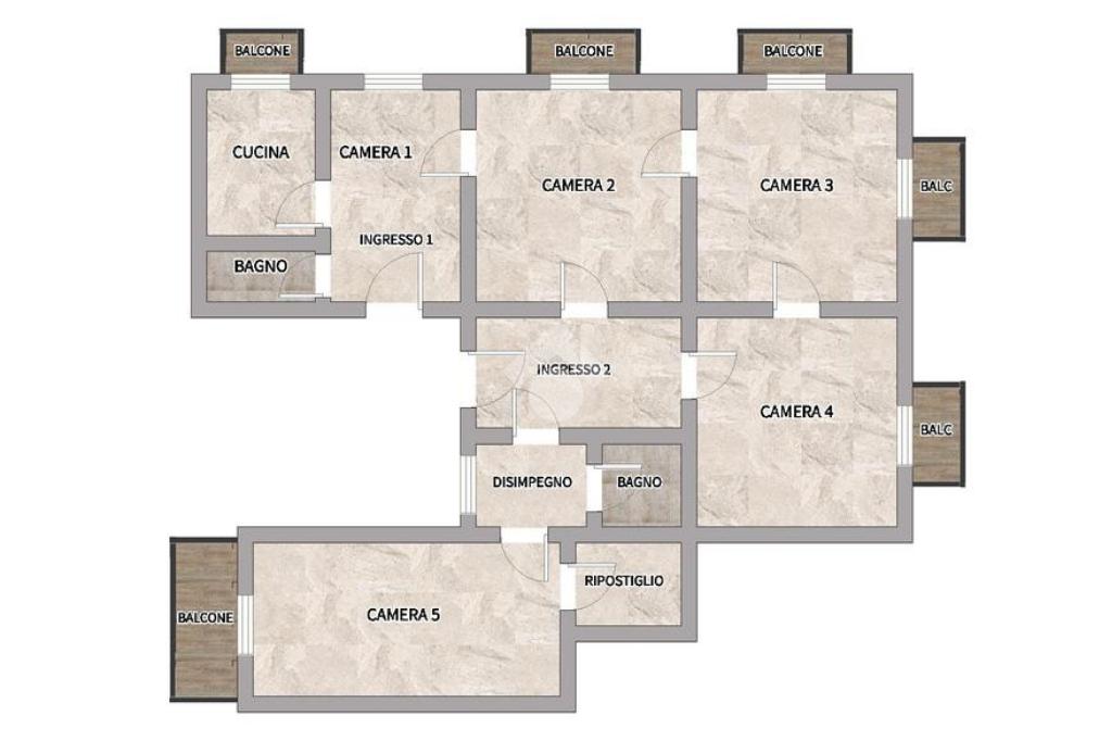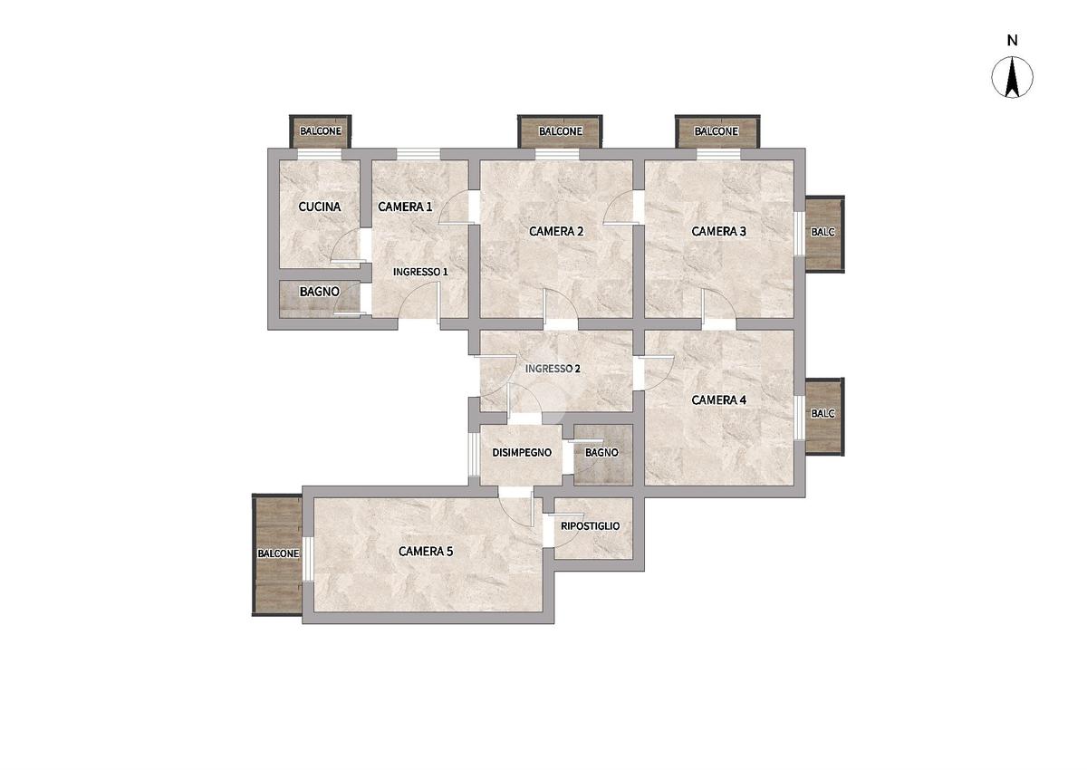 E' composto da 5 camere, tutte dotate di punto luce e con accesso al balcone, cucina abitabile, 2 bagni e ripostiglio.